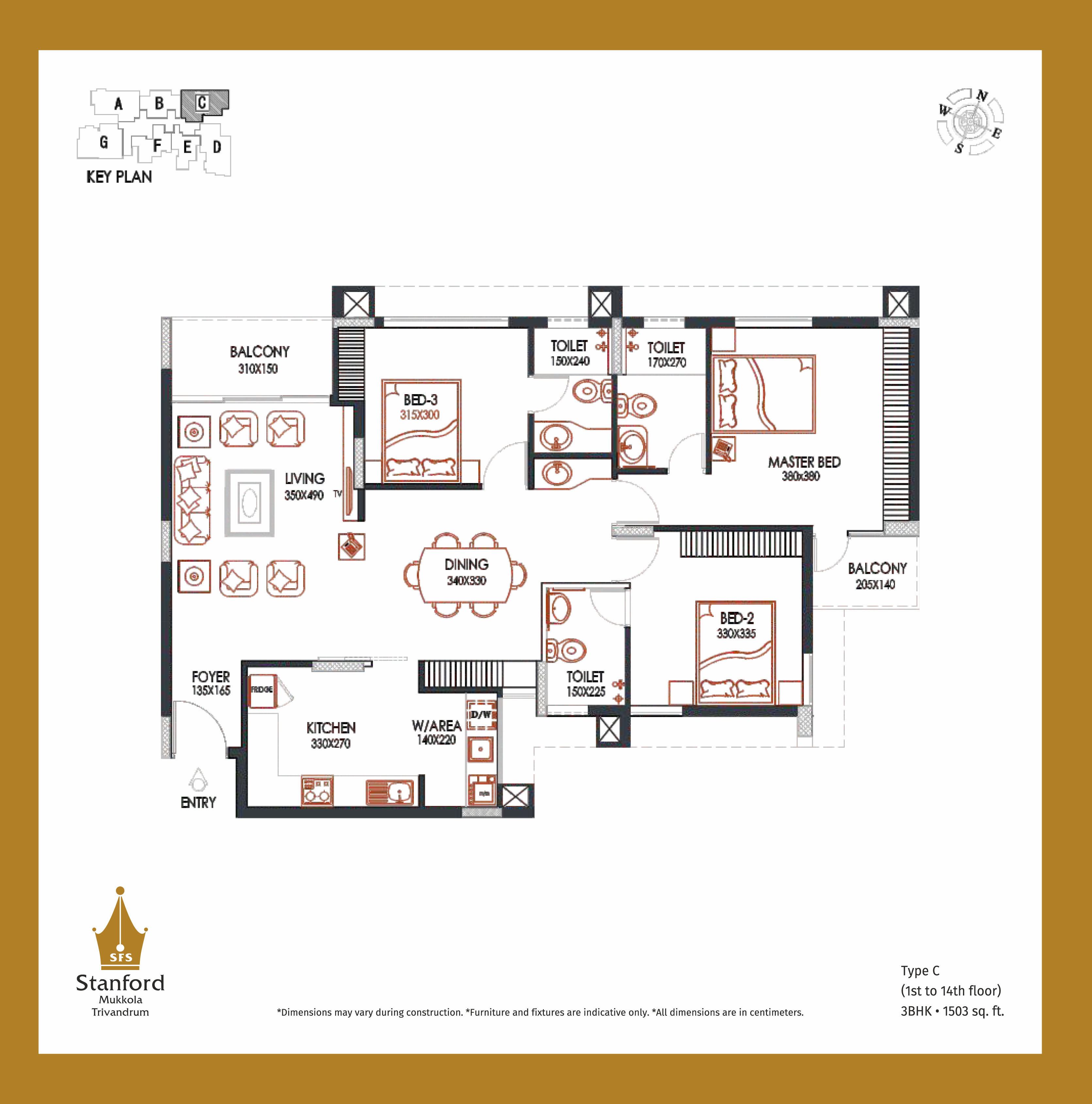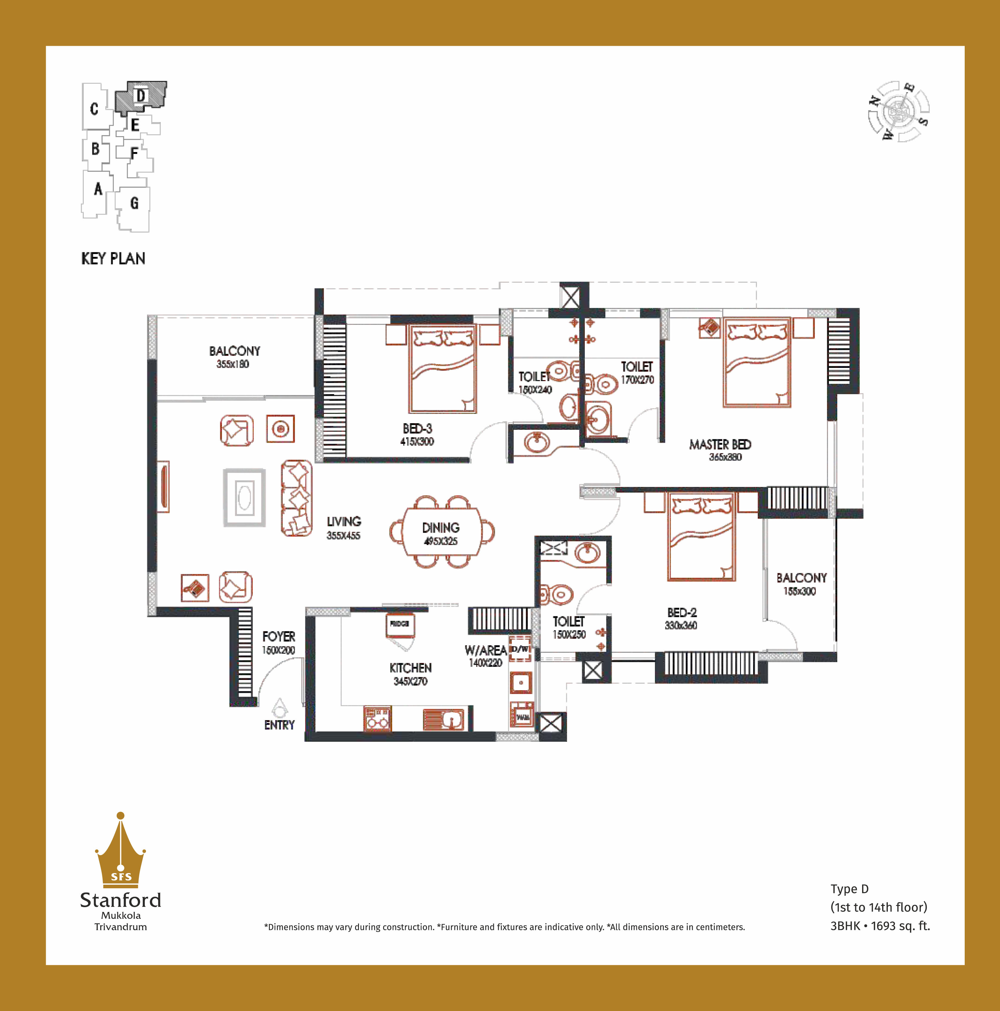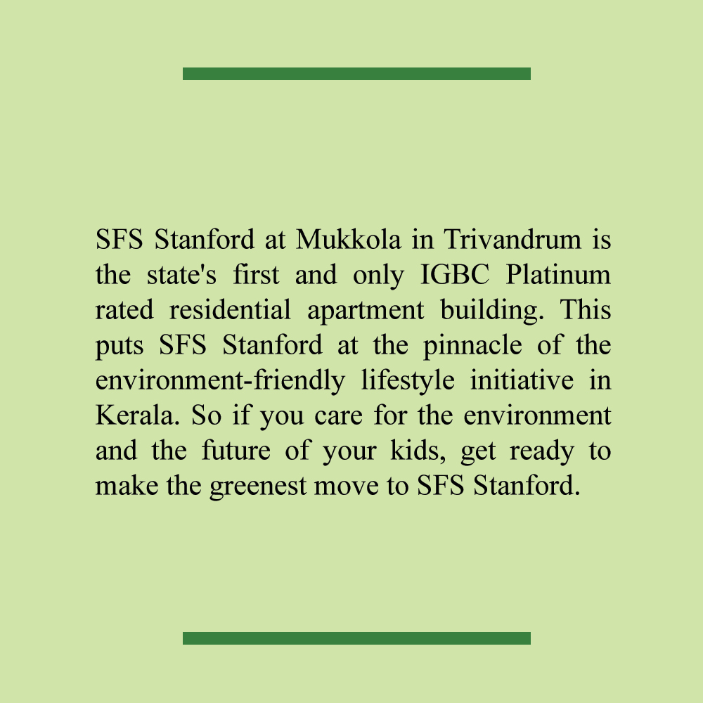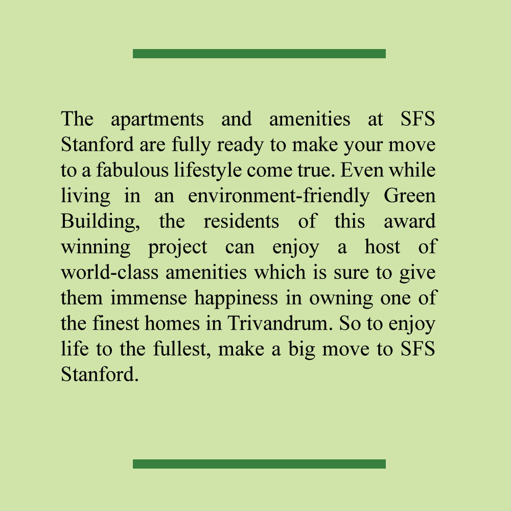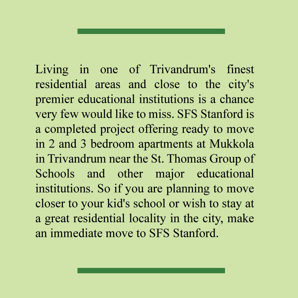 SFS Stanford is not just about education. It s also about being at the right spot with outstanding connectivity. Extremely close to some of the best educational institutions and the MC road, it also has an easy approach to the city centre, the NH bypass, and Technopark. This project comes to life in 2 and 3 bedroom that range between 1000 sq. ft. and 1750 sq. ft.